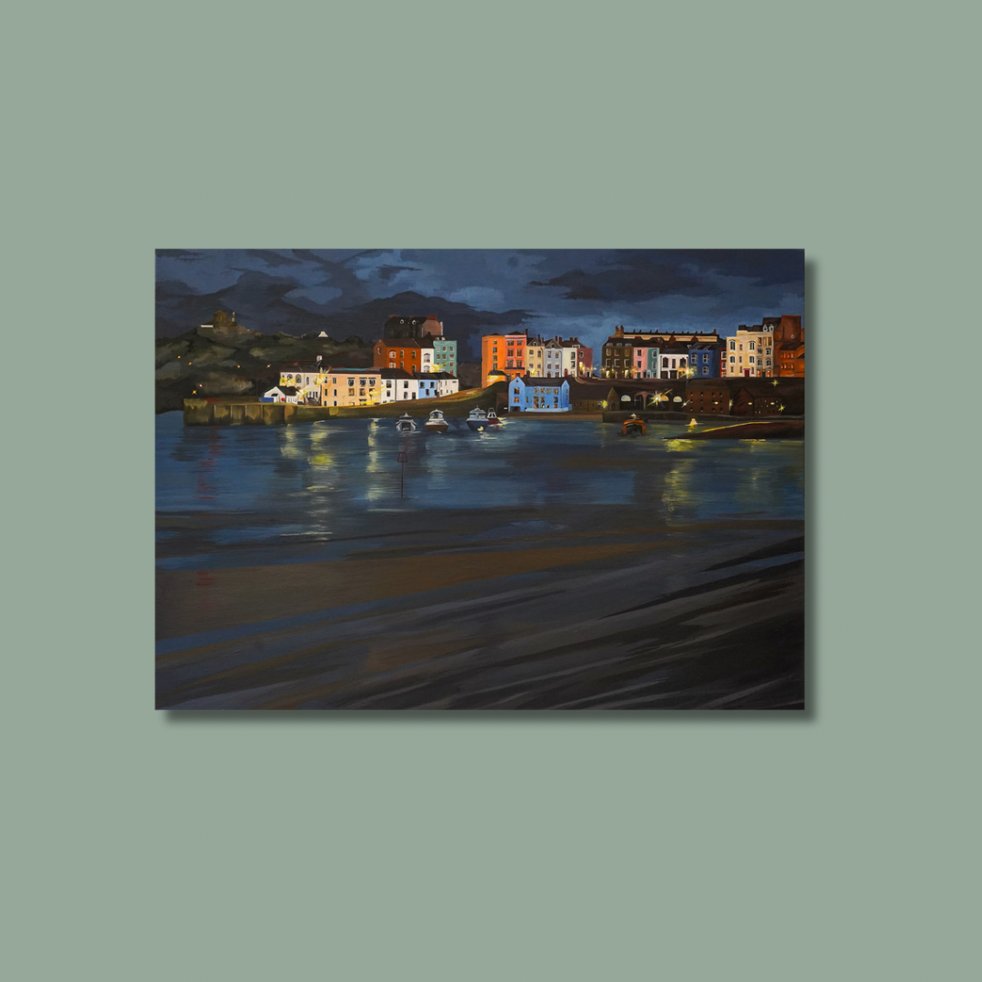 Tenby Harbour, an Autumn Evening. An original framed 90x65 cm acrylic painting on canvas by Welsh artist Caitlin Eve.