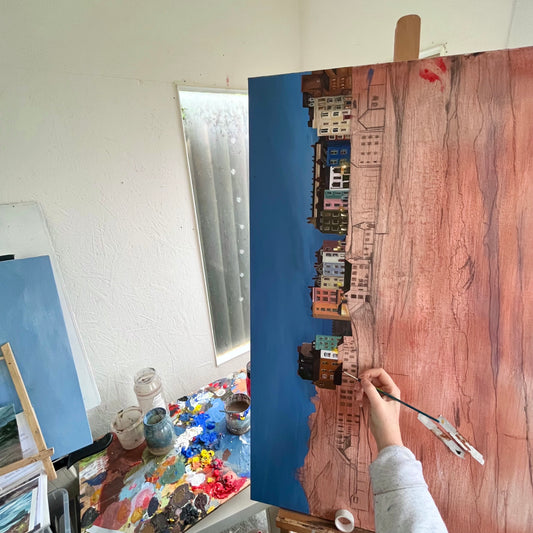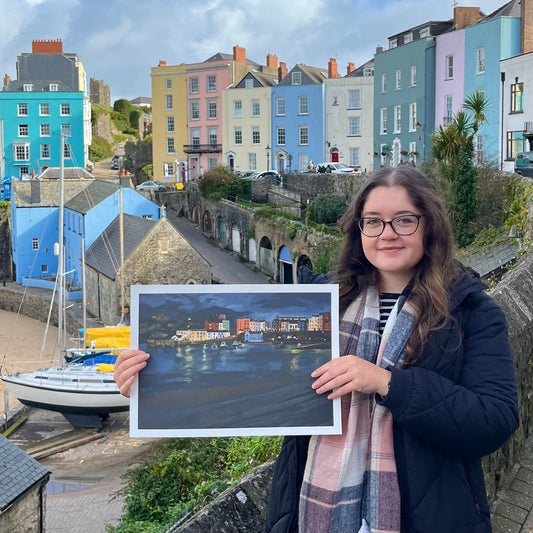 Tenby Harbour, an Autumn Evening. An original framed 90x65 cm acrylic painting on canvas by Welsh artist Caitlin Eve.