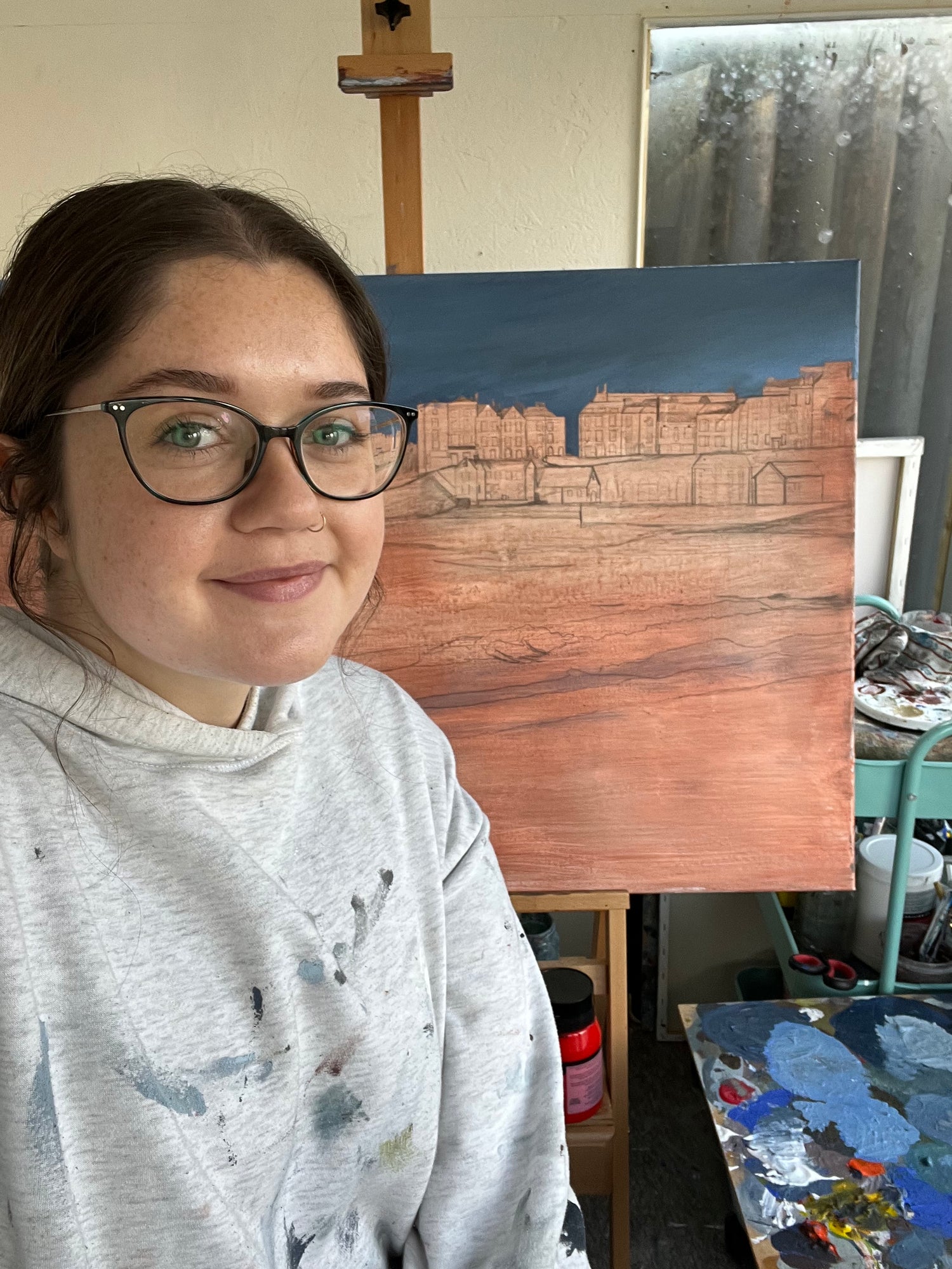Caitlin is a young Welsh artist working from her studio in South Wales, just a five-minute drive from Aberavon beach, a three-mile stretch of sandy beach on the north-eastern edge of Swansea Bay. Caitlin draws inspiration from the stretching shorelines and green mountains surrounding her in Wales and paints to express herself in colour and shape. Caitlin began painting to benefit her mental health, and those beginnings still stand at the forefront of Caitlin's creative endeavours today.