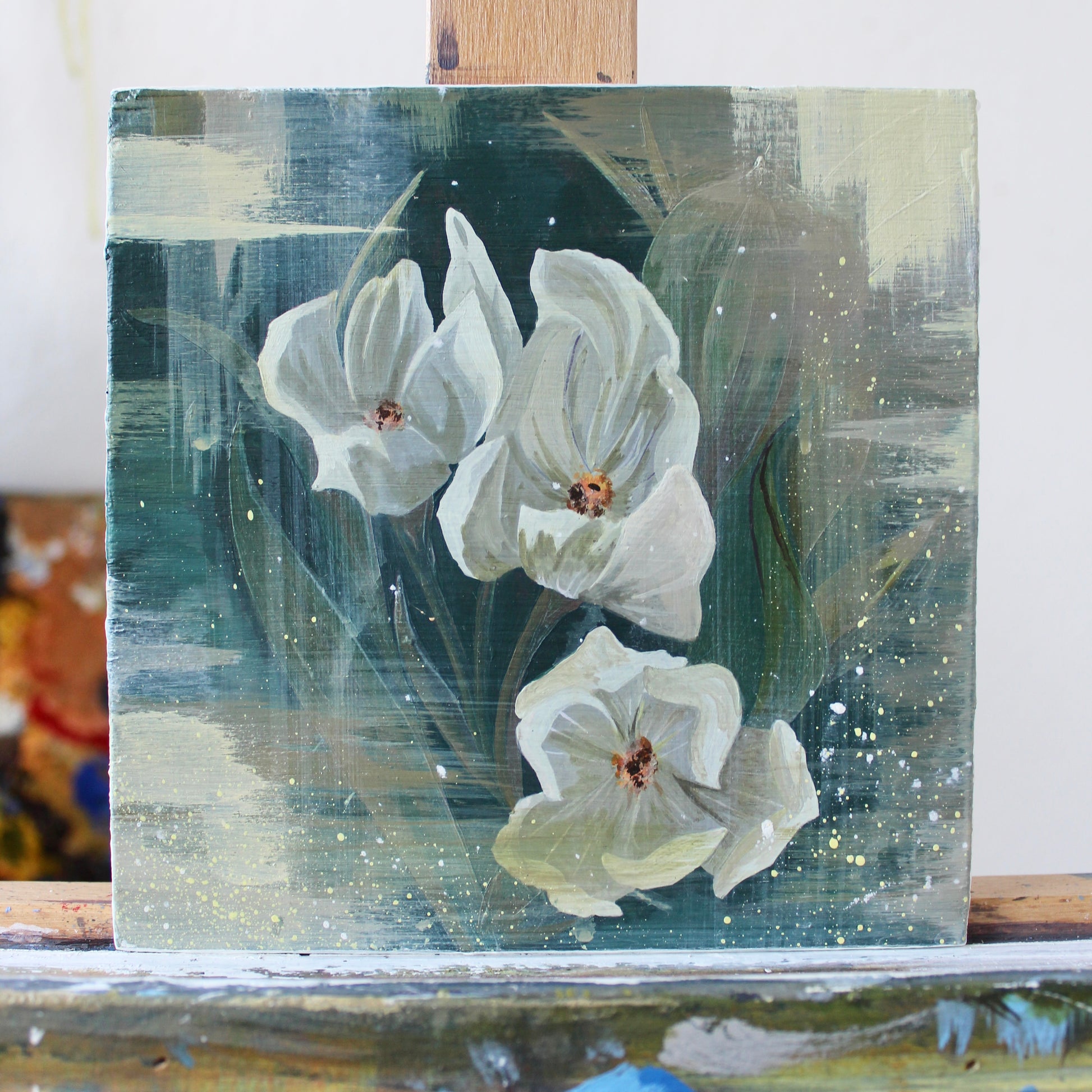 Inspired by a pot of flowers I came across one day while walking around Swansea, I painted these delicate white crocuses in acrylic on a 6 x 6 inch (16 x 16 cm) wood panel.