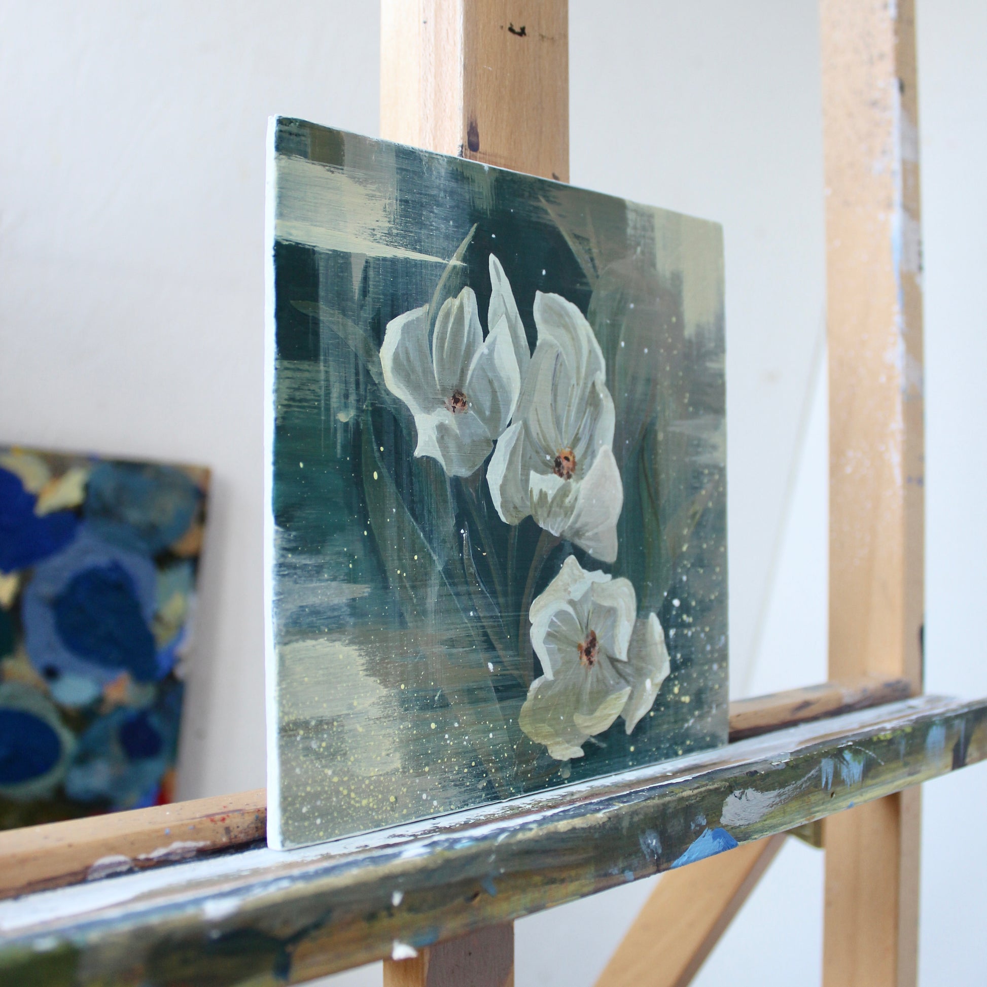 White Crocuses – Original Acrylic Painting on Wood Panel (6 x 6 in / 16 x 16 cm, Framed 13 x 13 in / 33 x 33 cm)